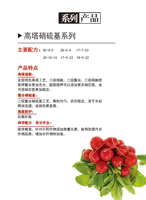 高塔硝硫基复合肥通常是由优质硝酸磷肥和硫酸钾为原料生产而成,比较常用的为15-15-15的配比式,其中产品中含有氨态氮、硝态氮两种氮肥,同时由于是采用硫酸钾为钾原料,产品中含有硫元素,相比采用氯化钾为原料生产的复合肥更有利于忌氯作物的生长。