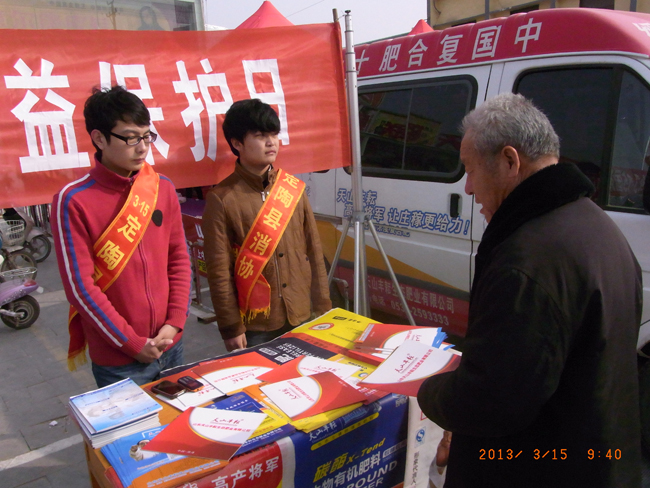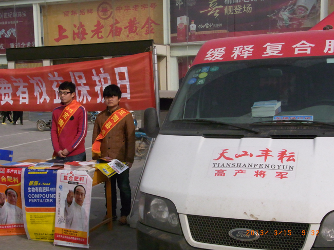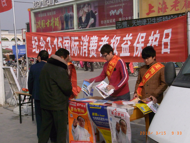 “3.15”国际消费者权益日即将到来之际,山东天山丰耘生态肥业有限公司组织开展一系列为农服务活动,为农民消费者送去放心农资和满意服务。天山公司通过参与县工商局组织的农资打假行动,组织人员深入田间地头,向农民传授识假辨假知识,帮助农民买到货真价实的肥料。同时公司以“质量促和谐,诚信谋发展”的质量月活动为核心,组织新产品销售员、宣传员、农化服务员分赴全国各销售区域,向经销商和广大农民宣传新产品、普及差异化肥料的选购知识。公司通过开展产品质量安全追溯管理工作,将肥料产品加贴防伪标签,方便农民通过网络、手机等多种方式辨别肥料真伪。图为天山公司工作人员向群众宣传识假辨假知识。