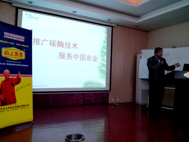 天山丰耘肥业副总经理范明雷出席会议并致辞,他对公司的现状及发展情况作了简要介绍,重点推介了公司新型升级换代产品——碳酶复合肥。美国BHN公司的技术专家就“碳酶技术及产品”为大家进行了详细讲解,阐明了碳酶技术的基本原理及碳酶的特点、作用机理和推广应用情况。
